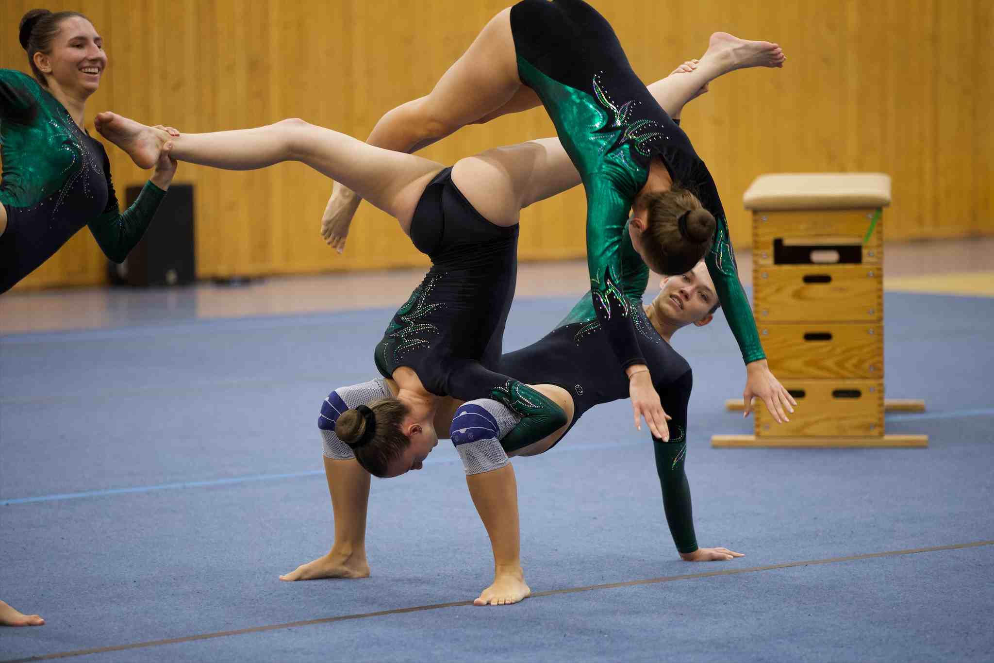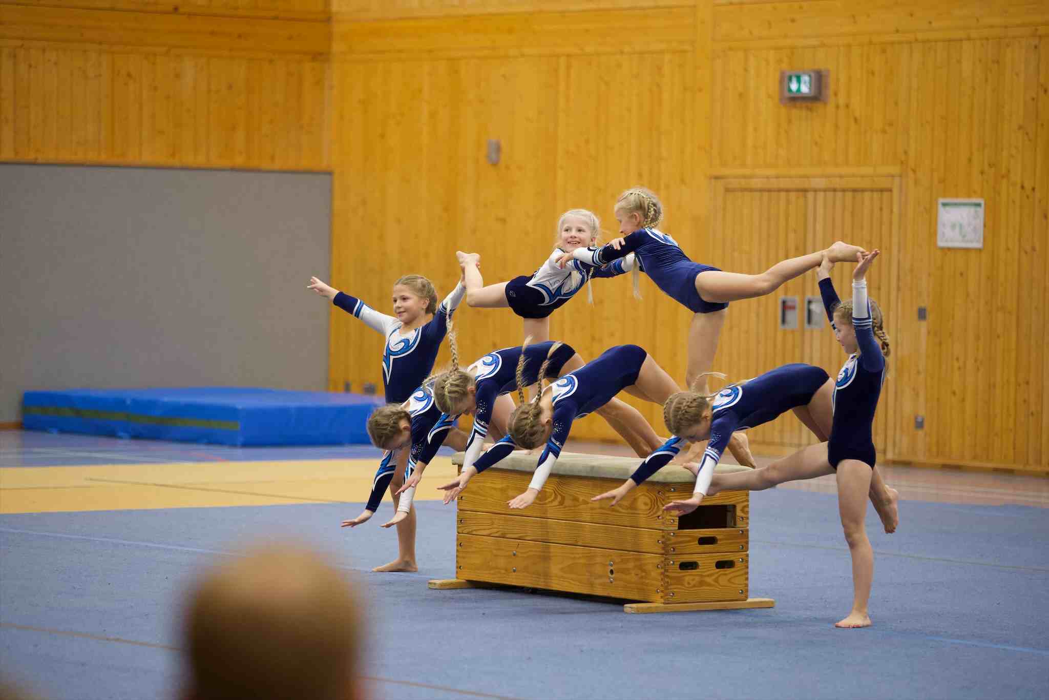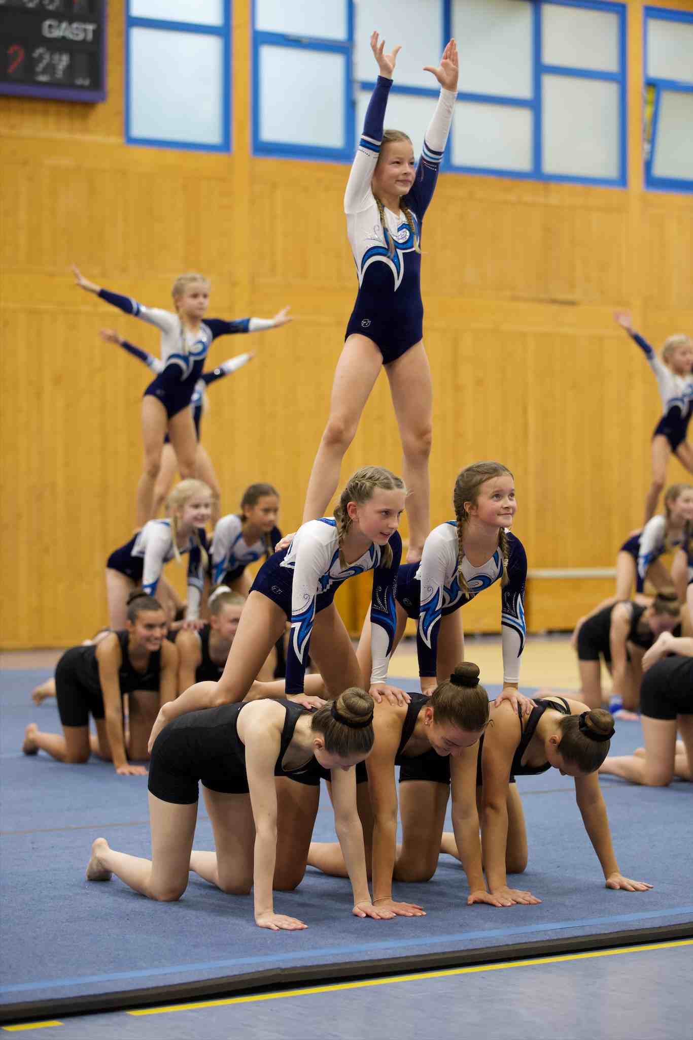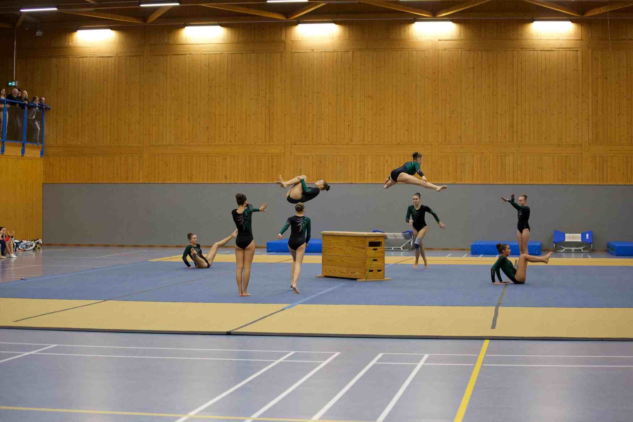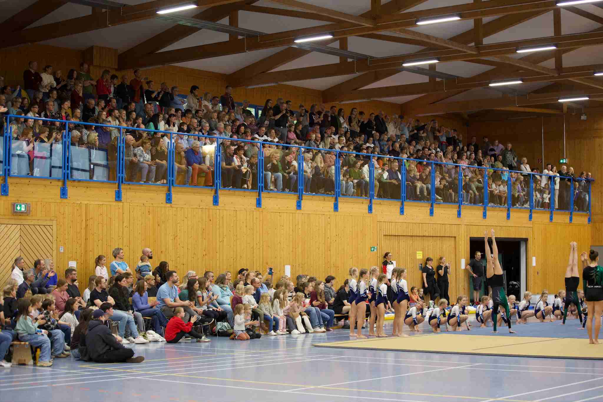 Vor voller Tribüne und noch vielen zusätzlichen Sitzplätzen im Innenraum der Turnhalle zeigten die 70 Turnerinnen und Turner im Alter von 6-21 Jahren ein beeindruckendes und kurzweiliges Programm bestehend aus den diesjährigen Choreographien der sechs verschiedenen Wettkampf-Mannschaften sowie aus gemeinsamen Tanz-, Turn-, Einrad-, Trampolin-, Airtrack- und Akrobatik-Nummern.